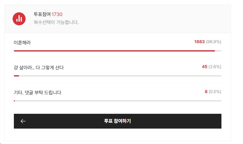 humor SPORTS SOS | 이혼 고민하는 블라인.blind 확인 필수 👤 작성자: SOS관리자 📅 날짜: 2026-04-07 15:31 👁️ 조회수: 734 당연하게도 투표결과는.. 이혼 고민하는 블라인.blind