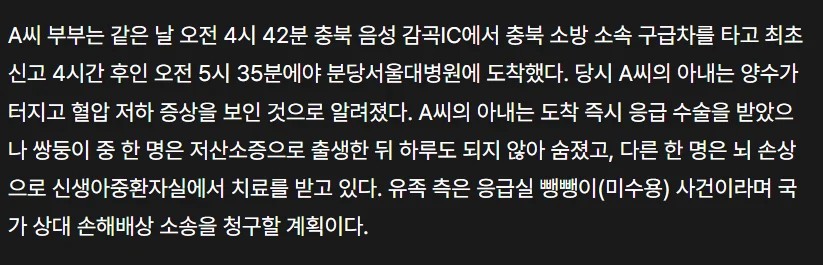 humor SPORTS SOS | "대구 응급실 뺑뺑이" 미국인 산모, 국가 상대 손해배상 소송 예정 👤 작성자: SOS관리자 📅 날짜: 2026-04-07 23:30 👁️ 조회수: 585 남편 산모 둘다 미국 국적이며 대구로 간 이유는