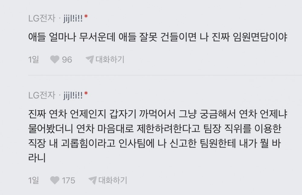 free SPORTS SOS | LG전자 팀장이 팀원들 못누르는 이유 [속보] 👤 작성자: SOS관리자 📅 날짜: 2026-04-08 04:30 👁️ 조회수: 195 본문 연차언제냐 물어본걸로 직괴로 신고한다함 이미 팀원들끼리 팀장괴롭히는걸로 카르텔 형성된듯 LG전자 팀장이 팀원들 못누르는 이유 SNS 공유