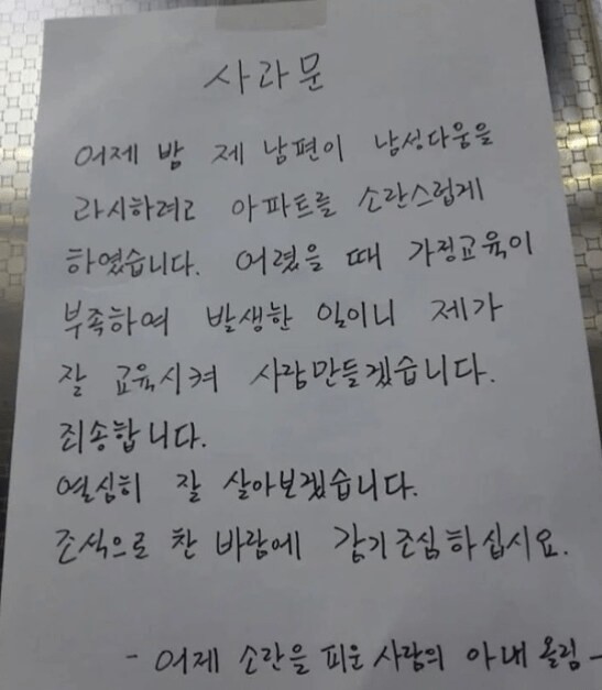 아내가 남편의 불미스러운 일에 올린 사과문