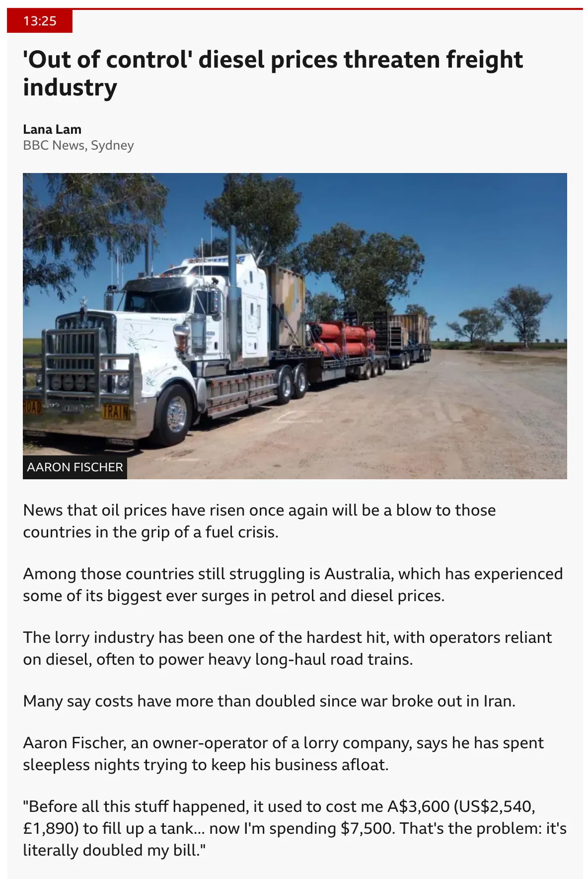 특히 디젤 연료를 사용하는 대형 장거리 로드 트레인(road trains) 운영사들이 주를 이루는 트럭 운송 업계가 가장 큰 타격을 입었습니다.
