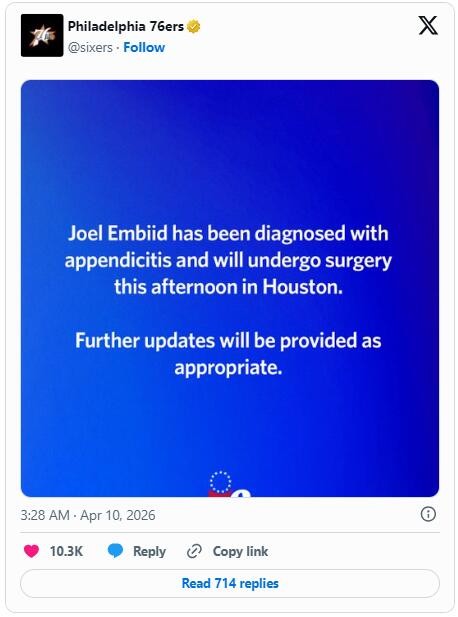 조엘 엠비드가 목요일(현지시간) 휴스턴에서 맹장 수술을 받았다. 전날 밤 필라델피아의 스타 빅맨이 급성 맹장염 증세를 보인 데 따른 조치다.