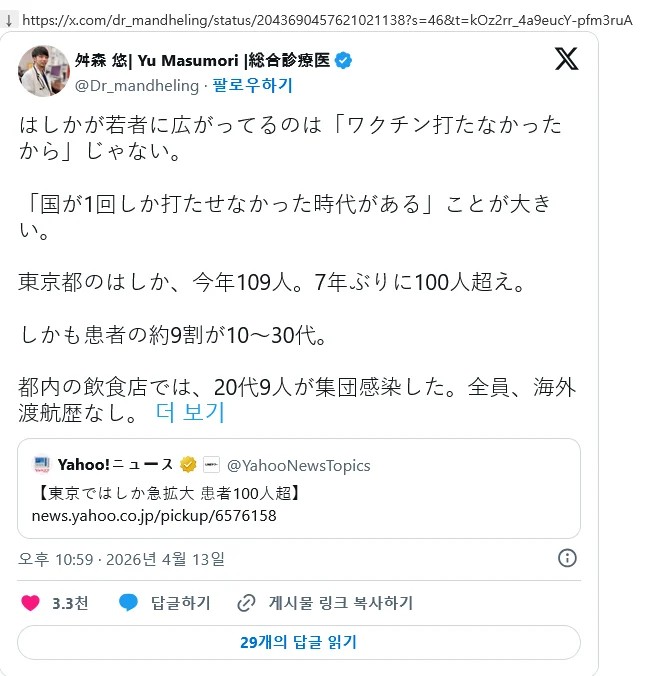 지금 일본에서 홍역 유행중이고